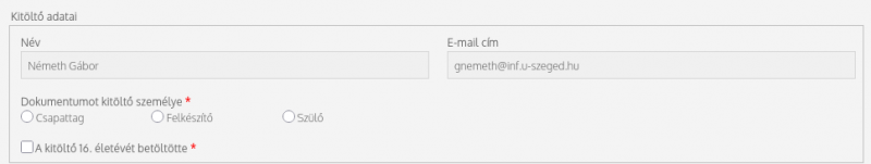 Kitöltő adatai A kitöltő adatainál a regisztráló adataival vannak feltöltve a mezők. A kitöltő lehet Csapattag (diák), Felkészítő, vagy Szülő. Ezek valamelyikét be kell jelölni. Amennyiben a kitöltő személy elmúlt 16 éves, úgy kattintsa be az erre a nyilatkozatra vonatkozó jelölőnégyzetet! |