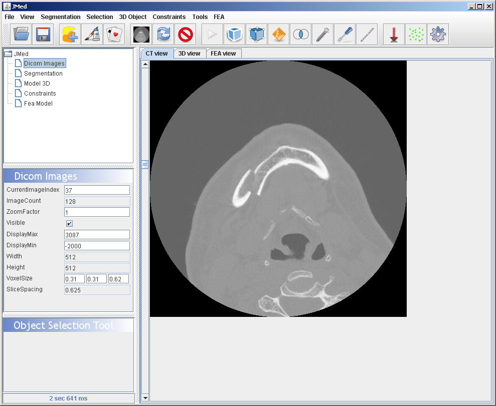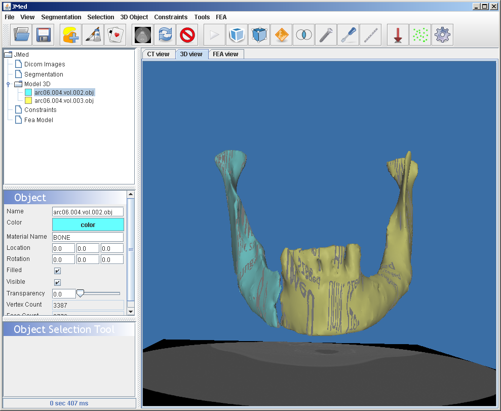 3D view. The cyan colored fragment is moved and rotated back to the position where it might have been before the fracture. Notice the difference to the CT image.