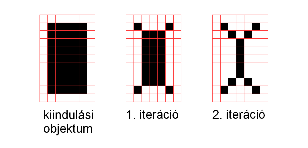 A vékonyítás (mint a leggyakrabban alkalmazott vázkijelölő módszer) iteratív objektum-redukció, melynek egy lépésében az aktuális objektum határpontjai közül a törölhetőnek minősítetteket távolítjuk el. Az eljárás terminál, ha az objektumon már nincs több törölhető pont. Az eredményül kapott kép a bemeneti kép objektumainak vázszerű jellemzőit tartalmazza (lásd 11. ábra).