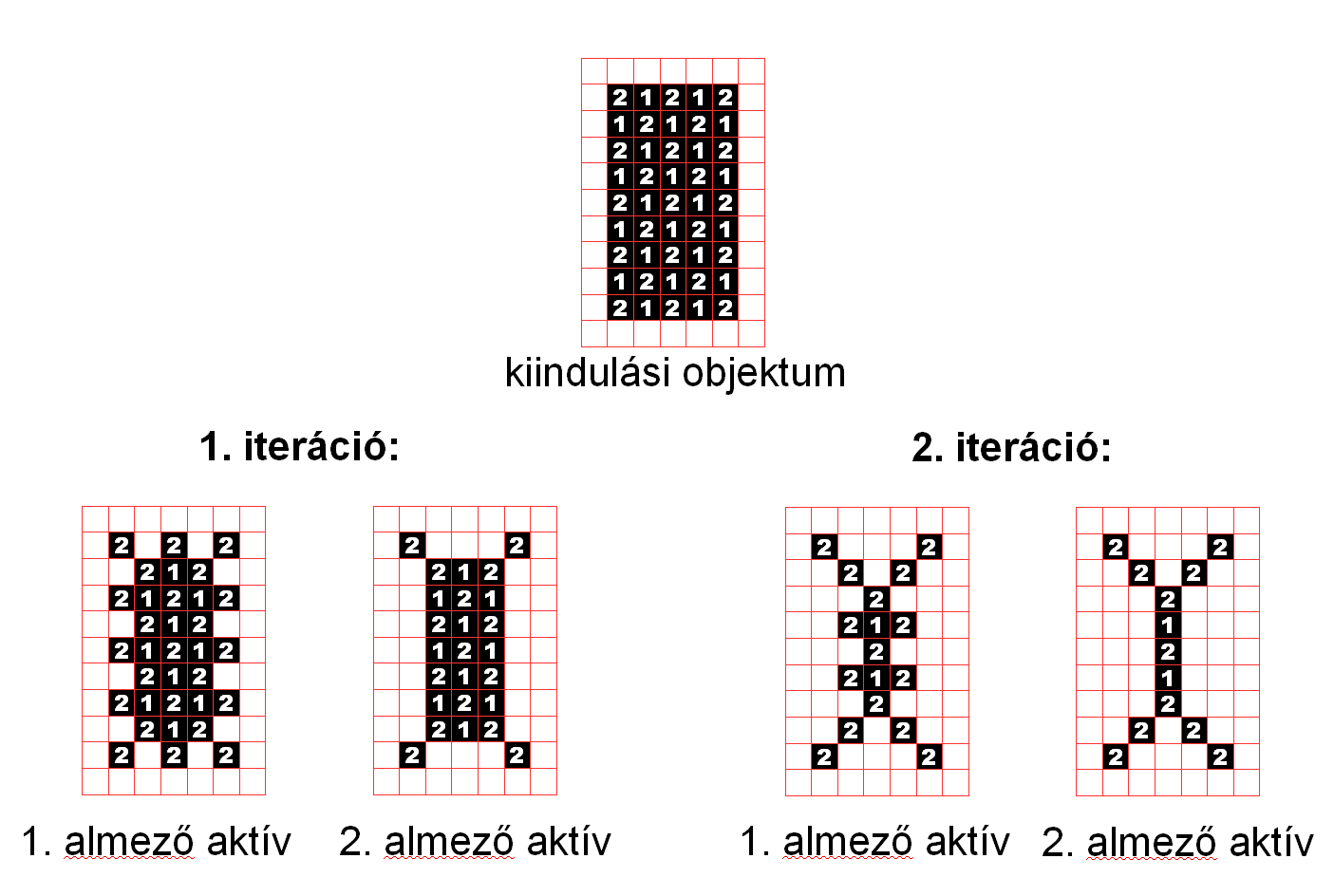 Az almező-alapú stratégia a képelemek halmazának diszjunkt részhalmazokra, ún. almezőkre történő particionálásán alapul. Az ezen elven működő algoritmusok egy iterációs lépése során az almezőket egymás után aktiváljuk, és az adott aliterációban csak az aktív almezőbe eső pontokat vizsgáljuk. A 14. ábra egy két almezőt megkülönböztető vékonyító algoritmus működését illusztrálja.