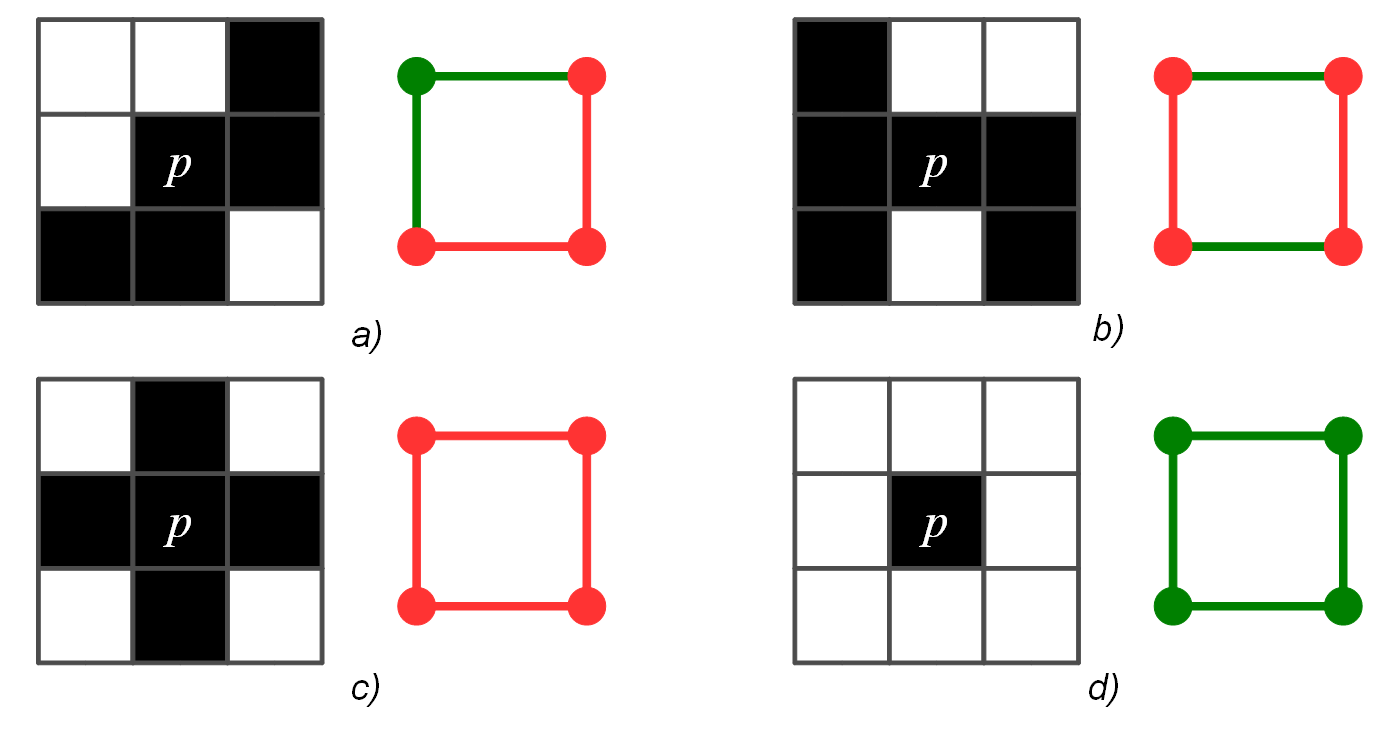 Példa: A 9. ábrán négy $\sc S$ mozaikbeli pixel szomszédsági konfigurációja, mellettük pedig a nekik megfelelő csatolt halmazok láthatók. A csatolt halmazhoz tartozó élek és csúcsok piros színnel, a csatolt halmaz komplementérehez tartozó élek és csúcsok zöld színnel vannak jelölve. Vegyük észre, hogy csak az a)konfiguráció reprezentál egyszerű pixelt.