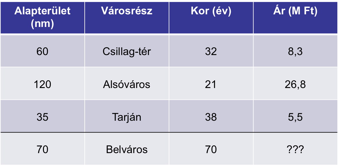 Tegyük fel, hogy egy szegedi ingatlanirodában dolgozunk. A múltbeli adás-vételek alapján egy regressziós modellt akarunk tanulni, ami meg tudja jósolni, hogy mennyiért tudunk majd kiközvetíteni egy lakást. Az egyedek itt adás-vételi ügyletek. A fenti minta adatbázisban az egyedeket három jellemzővel (alapterület és kor folytonos, míg a városrész folytonos jellemző) és az ár a célváltozónk. Az első három sor minta a tanító adatbázisból, ahol ismerjük a célváltozó igazi értékét. Az utolsó sor egy egyed, amire a modelltől várjuk a becslést az adás-vétel ár-ára.