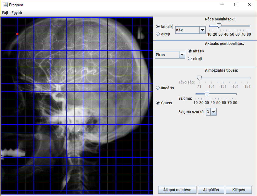 A bal egérgombbal kattintsunk egy rácspontra. Az vörös színnel jelenik meg. A bal egérgomb lenyomva tartásával új helyre mozgathatjuk, ami a szomszédos rácsok deormációját okozza. Más rácsba nem húzhatjuk át. Más pontra kattintva folytathatjuk a deformációt.