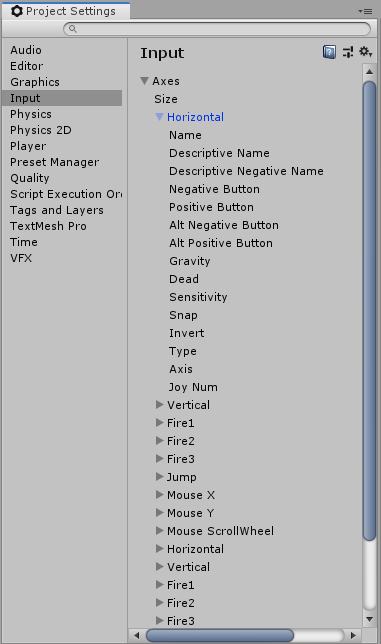 Ahogy az ábrán is látszik a Unity-ben a bemenetek kezelésére tengelyeket (axis) kell definiálni. A tengelyek elmozdulásából adódik a bemenet. Minden tengelynek van egy neve, és vannak pozitív, negatív gombjai, és egy aktuális értéke.