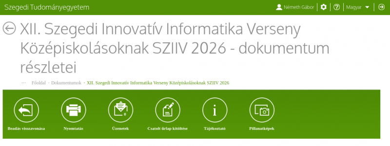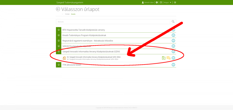 Verseny kiválasztása Nyissa le a Szegedi Innovatív Informatika Verseny Középiskolásoknak (SZIIV) űrlaplistáját! Válassza ki a megjelenő listából a XII. Szegedi Innovatív Informatika Verseny Középiskolásoknak 2026 versenyt! |