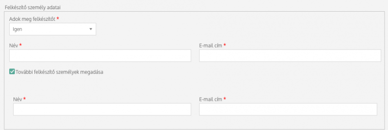 A felkészítő személy adatai Ennél a résznél először ki kell választani, hogy a csapatnak volt-e felkészítője. Amennyiben a csapatnak volt felkészítője, kérjük, hogy adja meg a felkészítő személy adatait! Amennyiben Ön bejelölte korábban, hogy felkészítő személyként tölti ki az űrlapot, már láthatja mezőkben saját adatait. Több felkészítő személy megadására is van lehetőség. Megjegyzés: a felkészítő személy nem feltétlen a diák iskolai tanára, lehet pl. a szülő is. |