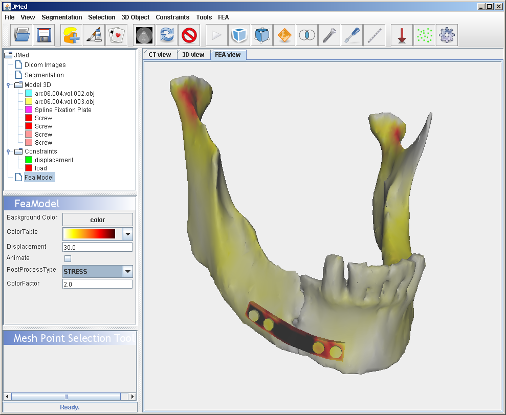 Mechanical model of the surgical plan. Green dots indicate the fix regions, and red dots indicate the region under load. The red arrow shows the direction of the load.