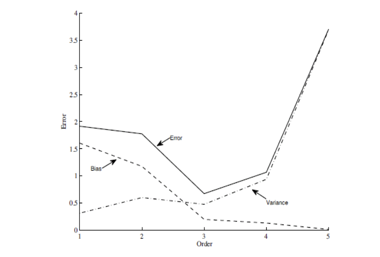A torzítás és variancia értékeket szemlélteti a következő ábra. Itt a fenti kísérletsorozatot megismetéljük másod és negyedrendű polinomakkal is mérjük a polinomokkal elért torzítást és varianciát.