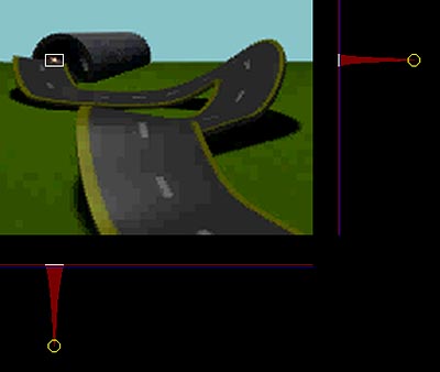 These are the first images of each sequence. Shown are the outline of the moving object and the movement vector. Notice (on the bottom and on the right) the projections of the corresponding B&W images. (click on the image to see an animation).