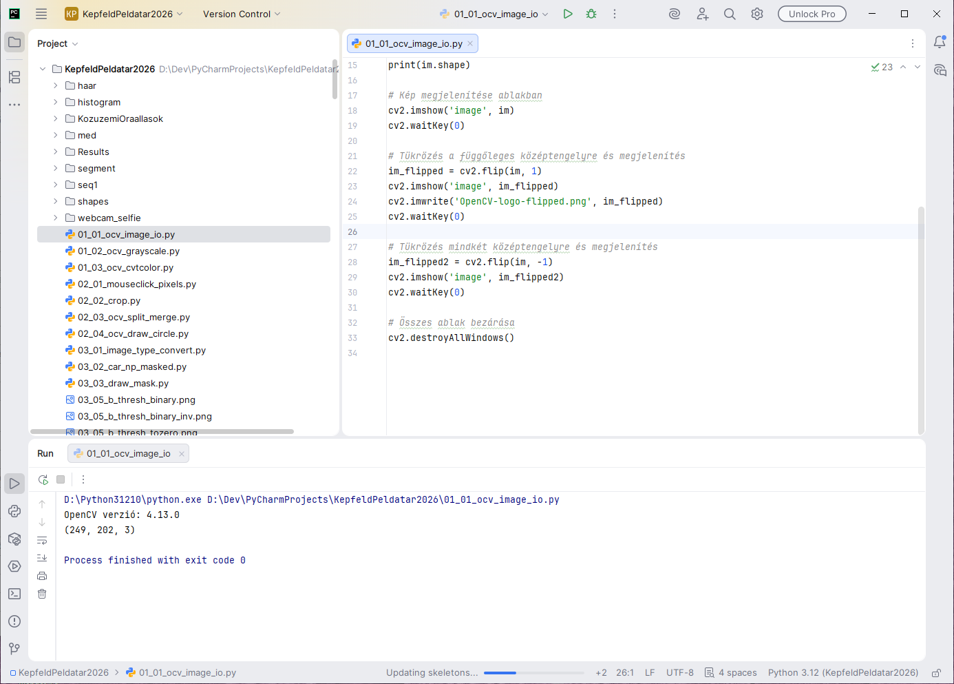 - Külső fájlkezelővel már meglévő fájlokat másolhatunk a projekt mappába. A PyCharm ezeket automatikusan detektálja és megjeleníti a listában. Ha mégsem jelennek meg, akkor a menüponttal manuálisan is aktualizálhatjuk a listát.