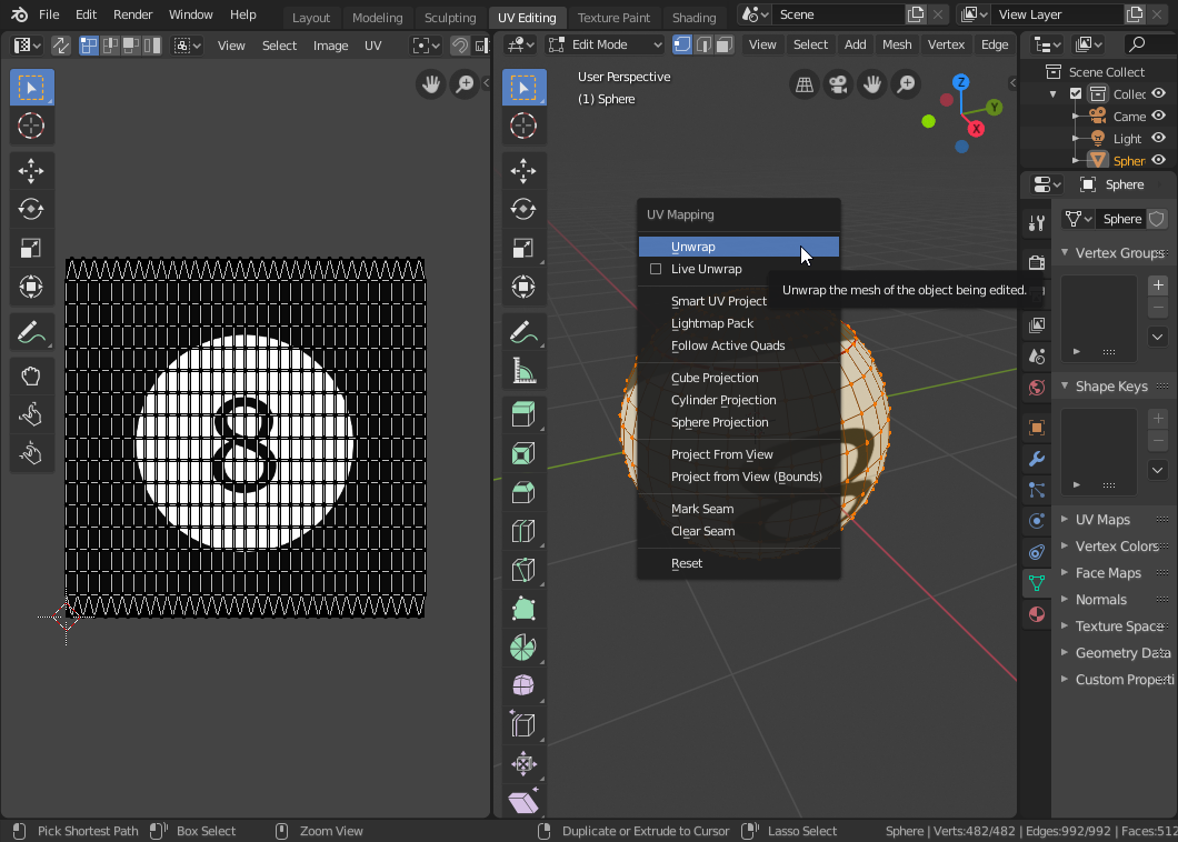 - Az alapértelmezett kockát cseréljük le egy UV gömbre.