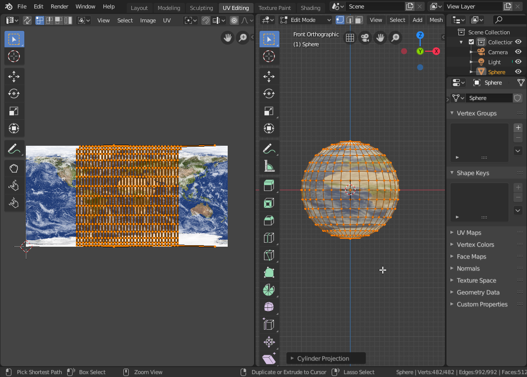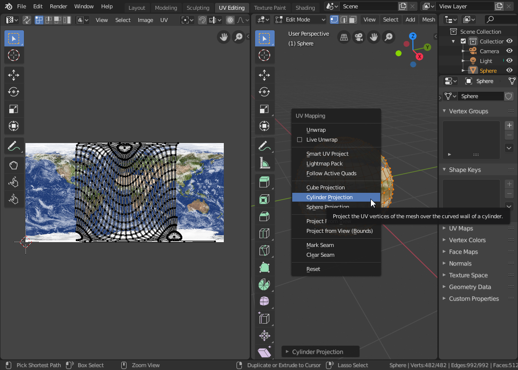 Gömb esetén az alapértelmezett kiterítés az esetek többségben megfelelő lesz. De választhatunk számos továbbit is (Sphere Projection, Cylinder Projection, ...).