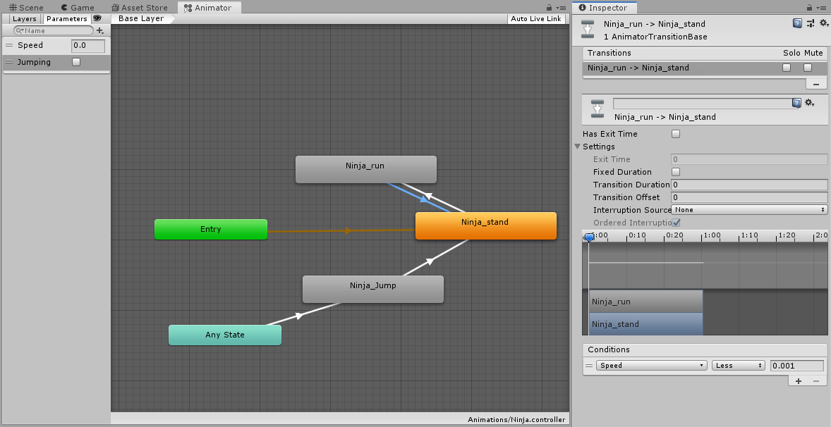 Az esetünkben hozzunk létre egy átmenetet a "Ninja_stand" állapotból a futás állapotba.