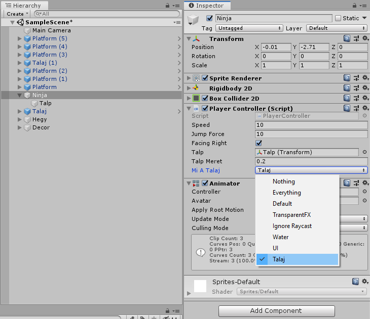 - Entry: A kezdőállapot. Amikor a program alindul, akkor ez az aktív állapot, de a program indításakor azonnal átadjuk az "aktív státuszt" annak az állapotnak, ahova a Entry-ből nyíl mutat. (Jelen esetben ez a Ninja_run állapot.)