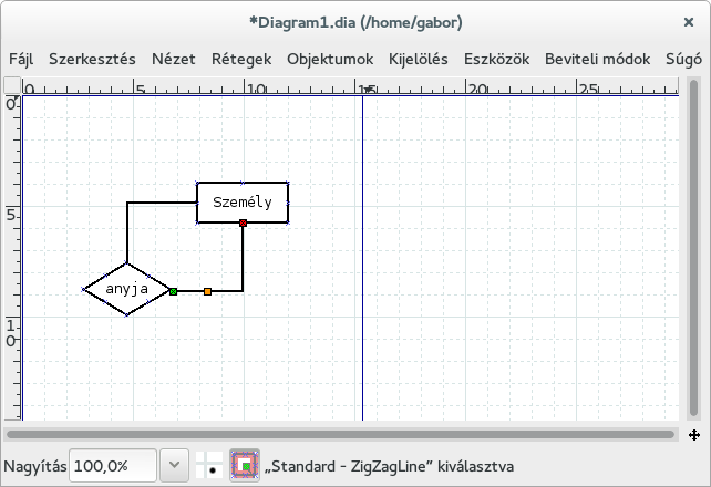 Válasszuk ki az eszköztár felső részéből a törött vonal rajzolást! Az rajzolt egyed és a kapcsolat körvonalán ×-szel jelölt pontokat látunk. Kössük össze ezeket. Amikor az × pont fölé megyünk az egérrel, a színe megváltozik.