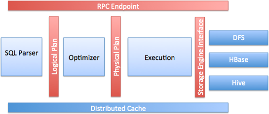 $ /opt/hive/bin/beeline -u jdbc:hive2://localhost:100000: jdbc:hive2://localhost:10000> CREATE TABLE pokes (foo INT, bar STRING);0: jdbc:hive2://localhost:10000> LOAD DATA LOCAL INPATH '/opt/hive/examples/files/kv1.txt' OVERWRITE INTO TABLE pokes;0: jdbc:hive2://localhost:10000> select * from pokes where foo>100 and foo<110;+------------+------------+| pokes.foo | pokes.bar |+------------+------------+| 103 | val_103 || 103 | val_103 || 104 | val_104 || 105 | val_105 || 104 | val_104 |+------------+------------+5 rows selected (0.12 seconds)Az Apache Impala [13] az Apache Hive komponenseit felhasználva (metastore, Hive SQL, ODBC driver, felhasználói felület) nyújt SQL alapú MPP (Massive Parallell Processing) interaktív adat lekérdezési lehetőséget HDFS-en vagy HBase-ben tárolt adatokhoz. A Hive-val ellentétben a valós idejű lekérdezéseket is támogatja. A késleltetés kiküszöbölése érdekében az Impala megkerüli a MapReduce-t, hogy az adatokhoz egy saját elosztott motoron keresztül férjen hozzá. Ezáltal egy nagyságrenddel gyorsabb lekérdezéseket tesz lehetővé, mint a Hive (konfigurációtól függően). Jelenleg az Impala a leghatékonyabb SQL motor a HDFS fölött. Az Impala architektúrája [14] a következő ábrán látható.