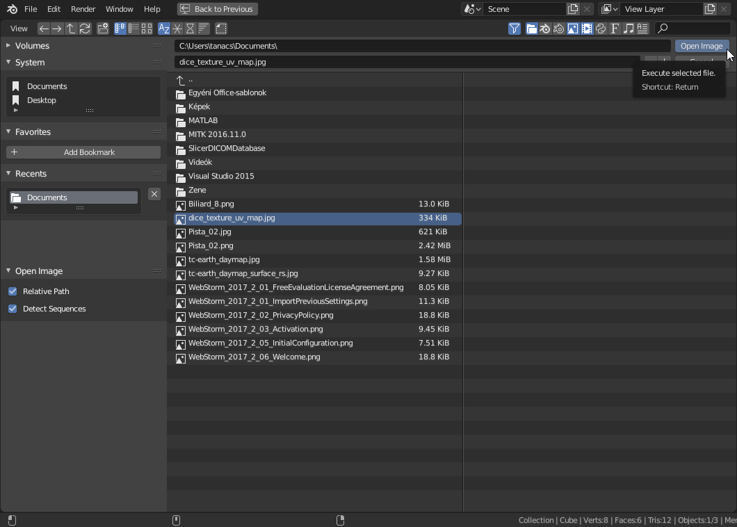 - A lenyíló alsó részen kattintsunk az Open Image gombra, és válasszuk ki a fájlrendszeren a kívánt textúra képet.