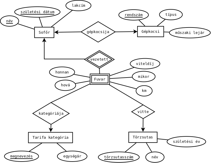 Sofőr(név, születési dátum, lakcím, rendszám)