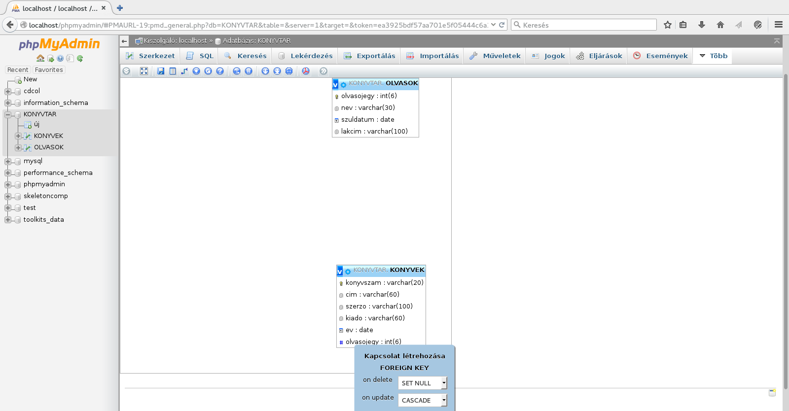 Válasszuk ki az oldalsó menüben a KONYVTAR adatbázist, hogy a két táblát lássuk! A fenti menüsorban válasszuk a Több lenyíló listát és válasszuk a Tervező nézetet! Válasszuk ki a kapcsolat létrehozása ikont a felső ikonsorból, majd jelöljük ki először az OLVASOK.olvasojegy mezőt, majd a KONYVEK.olvasojegy mezőt. A rendszer egyébként mutatja, hogy mikor mit kell kijelölni. Ha minden rendben van, akkor felajánlja a FOREIGN KEY kapcsolatot és be lehet állítani, hogy mi történjen módosítás és törlés esetén. Válasszuk a módosításnál a CASCADE opciót (vagyis, ha módosul az olvasójegy, akkor módosul a külső kulcs érték is), a törléshez pedig a SET NULL opciót.