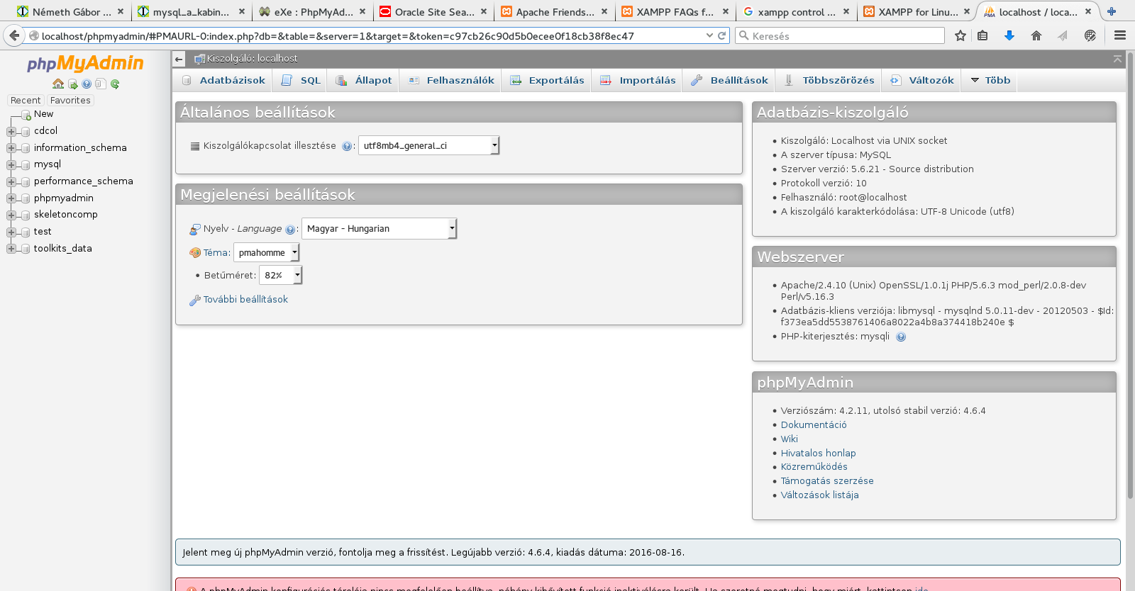 Indítsuk el a PhpMyAdmin segédprogramot a localhost-on futó XAMPP kezdőoldaláról, vagy írjuk az alábbi címet a böngésző címsorába: