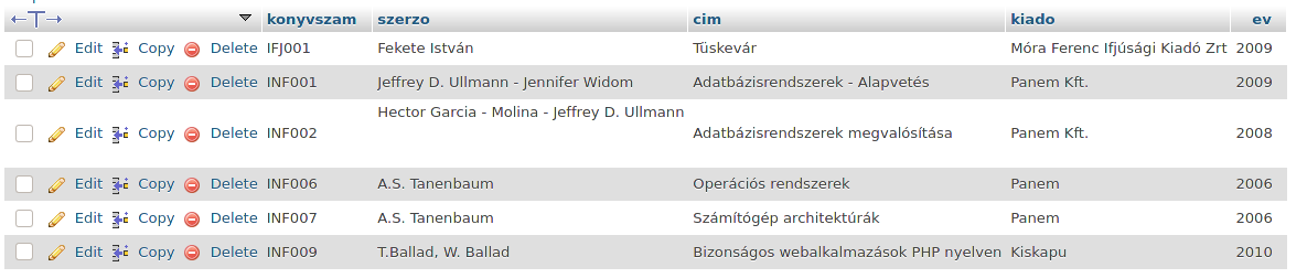 Tegyük fel, hogy a könyvtári alkalmazásunkban szeretnénk egy olyan funkciót készíteni, amely megmutatja a könyvtárunk tartalmát. A teljes KONYVEK táblát nem listázhatjuk ki, mert ott van az olvasójegy, amely bár nem személyes adat, nem kell, hogy megjelenítsünk egy ilyen funkciónál.