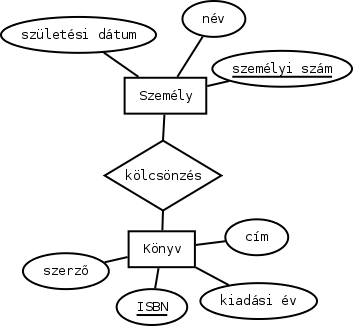 Attribútum: egyedek és kapcsolatok tulajdonságát jelöli (pl. egy személy egyed esetében tulajdonság lehet a név, lakcím, születési dátum, adóazonosító). Minden egyed kell, hogy rendelkezzen legalább egy attribútummal. Kapcsolatok is rendelkezhetnek attribútummal (pl. könyvtári adatbázisban a kölcsönzés kapcsolat rendelkezhet egy mikor attribútummal, amely a kölcsönzés dátumát jelöli). Az attribútumokat ellipszissel jelöljük és beleírjuk a nevét. Azt a legszűkebb attribútumhalmazt, amely egyértelműen azonosítja az egyedet kulcsnak nevezzük. A kulcsban szereplő attribútumok nevét aláhúzással jelöljük. (Lásd a fenti példákat.)