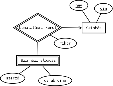 Meghatározó kapcsolat: gyenge entitást meghatározó kapcsolat (pl. ha a színházi előadás gyenge egyed, akkor meghatározó kapcsolattal hozzákapcsolhatjuk egy színházhoz és ez a kapcsolat rendelkezik egy mikor attribútummal, amely a kezdési időpontot mutatja). A meghatározó kapcsolat jele a duplavonalas rombusz.