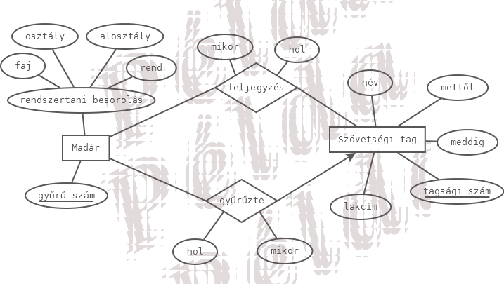 - Madár: gyűrű száma, rendszertani besorolás (faj, osztály, alosztály, rend), ki gyűrűzte meg, hol történt a gyűrűzés