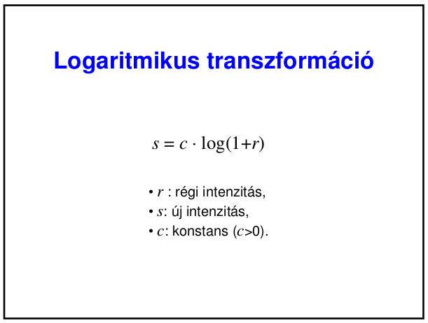 Az intenzitás transzformációknál a intenzitás értékeket egy megadott függvény szerint változtatjuk.