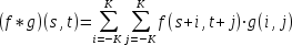 A 2-dimenziós f kép konvolúciója a ((2K+1) x (2K+1) méretű) g konvolúciós függvénnyel: