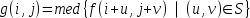 A vizsgált p=(i,j) képpont új intenzitása a szűrő által lefedett pixelintenzitások mediánjaként jön létre.