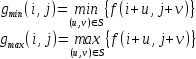 A min és max szűrők esetében a vizsgált p=(i,j) pont intenzitása rendre az S ponthalmaz által lefedett képpontok intenzitásainak minimumaként és maximumaként áll elő.