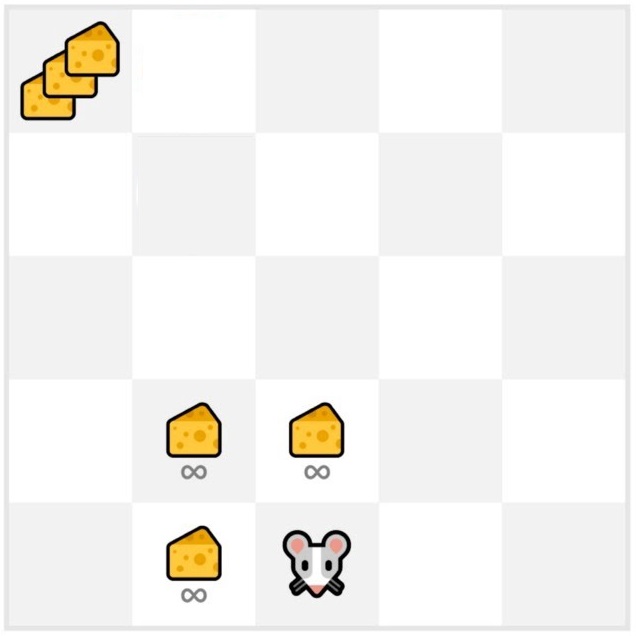 Vegyük a fenti képen látható példát. Tegyük fel, hogy az egér csak azoknak a mezőknek a tartalmát ismeri, ahol járt már és a melette lévő sajtokért +1 jutalom jár, a bal-felső sarokban lévő extra sajtért pedig +1000. Itt az egér nagyon könnyen megtalálhatja a szomszédjában lévő sajtokat, és a végtelenségig fogyaszthat belőlük. Ha nem próbál meg új utakat akkor sosem érheti el az extra sajtot, viszont, ha nem lenne extra sajt, akkor a keressel fölösleges időt veszítene, amíg ehetné a szomszédjában lévő sajtokat.