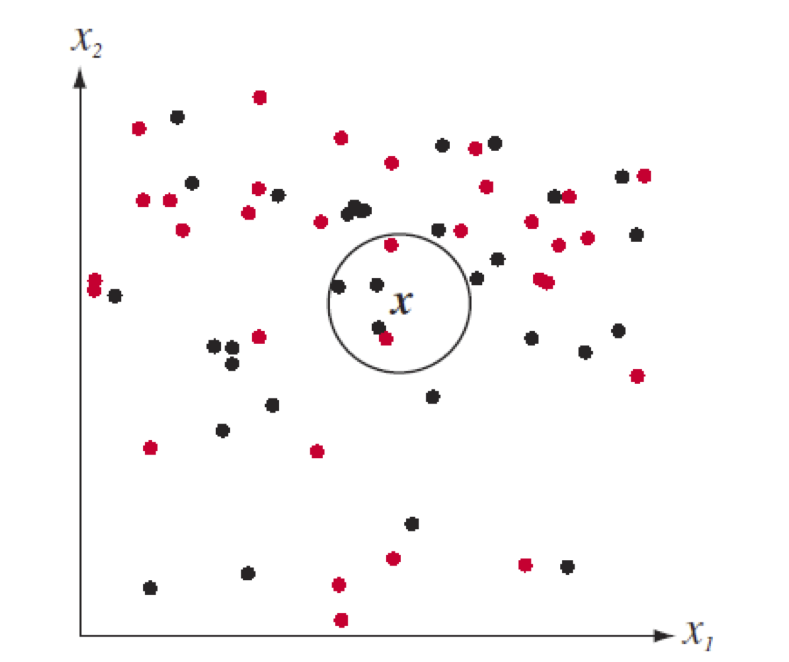 Legyen két folytonos jellemzőnk \(x_1\) és \(x_2\). Az alábbi ábrán a színes pontok a tanító adatbázis egyedei, amiknek két koordinátája a két jellemző, színük pedig az osztálycímkét jelöli. Legyen az egyedek közti távolság mérték az euklideszi távolság. Középen az x pont egy egyed amire predikálni szeretnénk. A k=5 legközelebbi szomszéd (euklideszi távolság alapján) a körön belüli 5 tanító adatbázisbeli egyed. Az öt szomszédból kettő piros és három fekete, ezért a fekete osztályt fogja predikálni az osztályozó.