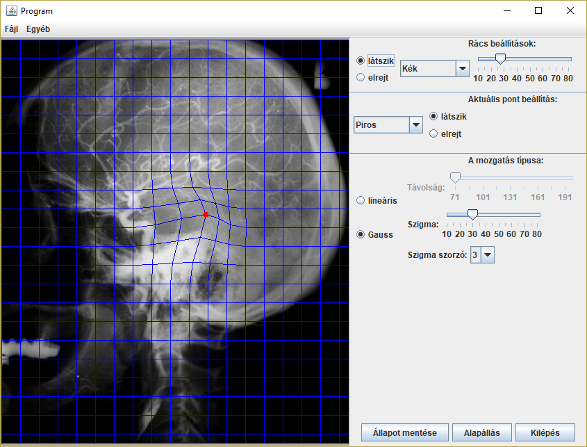 A bal egérgombbal kattintsunk egy rácspontra. Az vörös színnel jelenik meg. A bal egérgomb lenyomva tartásával új helyre mozgathatjuk, ami a szomszédos rácsok deormációját okozza. Más rácsba nem húzhatjuk át. Más pontra kattintva folytathatjuk a deformációt.