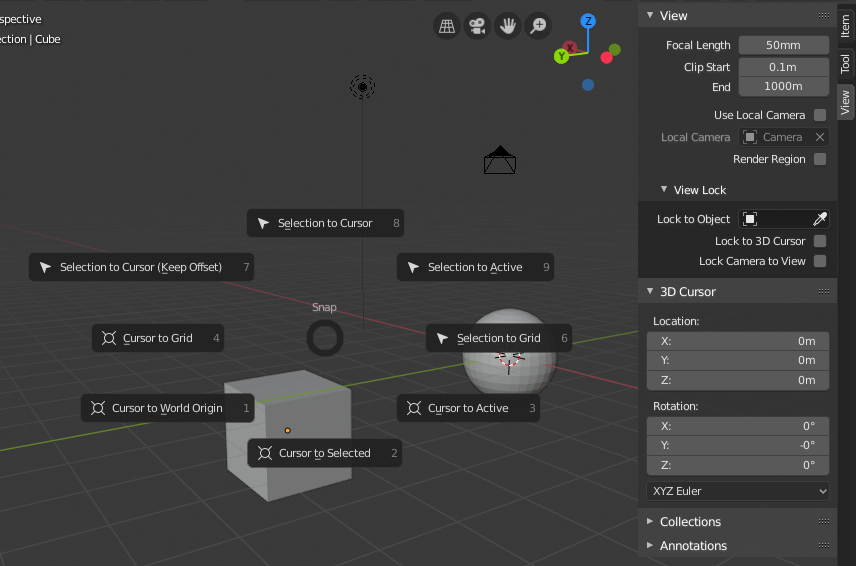 - A Snap paranccsal (Shift + S) különféle igazításokat végezhetünk, például a 3D kurzor mozgatását a világ koordináta-rendszer origójába 1, a kiválasztott 2 vagy aktív okjektum 3 lokális origójához, vagy a szálkereszthez legközelebbi rácspontra 4.