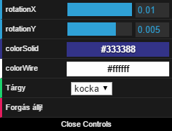 gui.add( guiParams, 'object', [ 'kocka', 'gömb' ] ).name( 'Tárgy' );